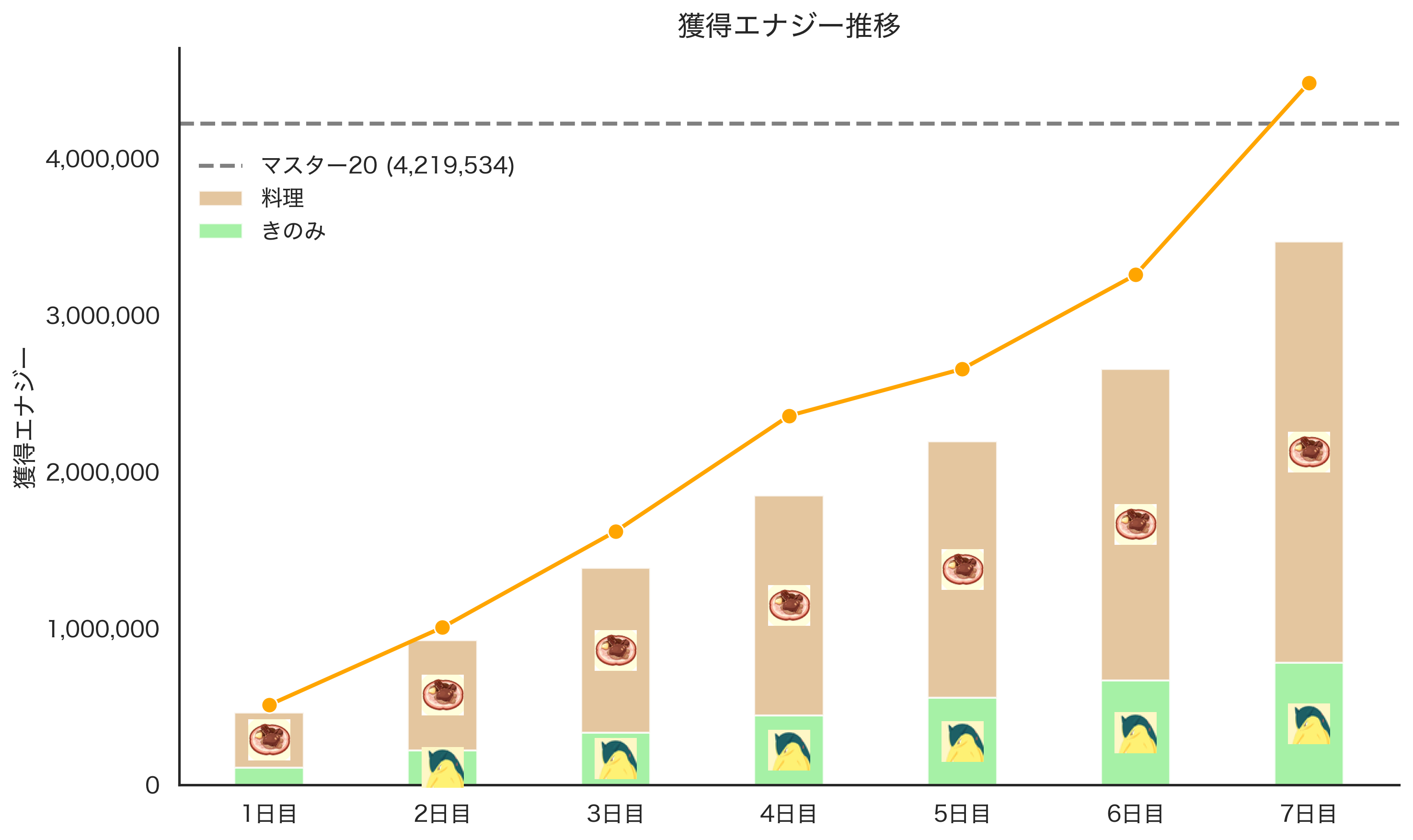 きのみエナジーは固定で入れていたバクフーンのみのエナジーを、期待値チェッカーを参考にした値で算出しています。また、料理エナジーはドオーのエクレア Lv.50 として計算しているため、実際より少なめに表示されています。
